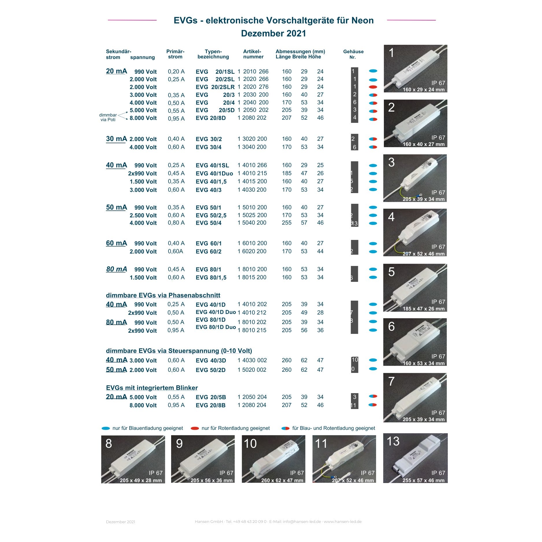 Hansen-EVG für Neon-Röhren-20mA 990V-2000V -EVG 20/2SL