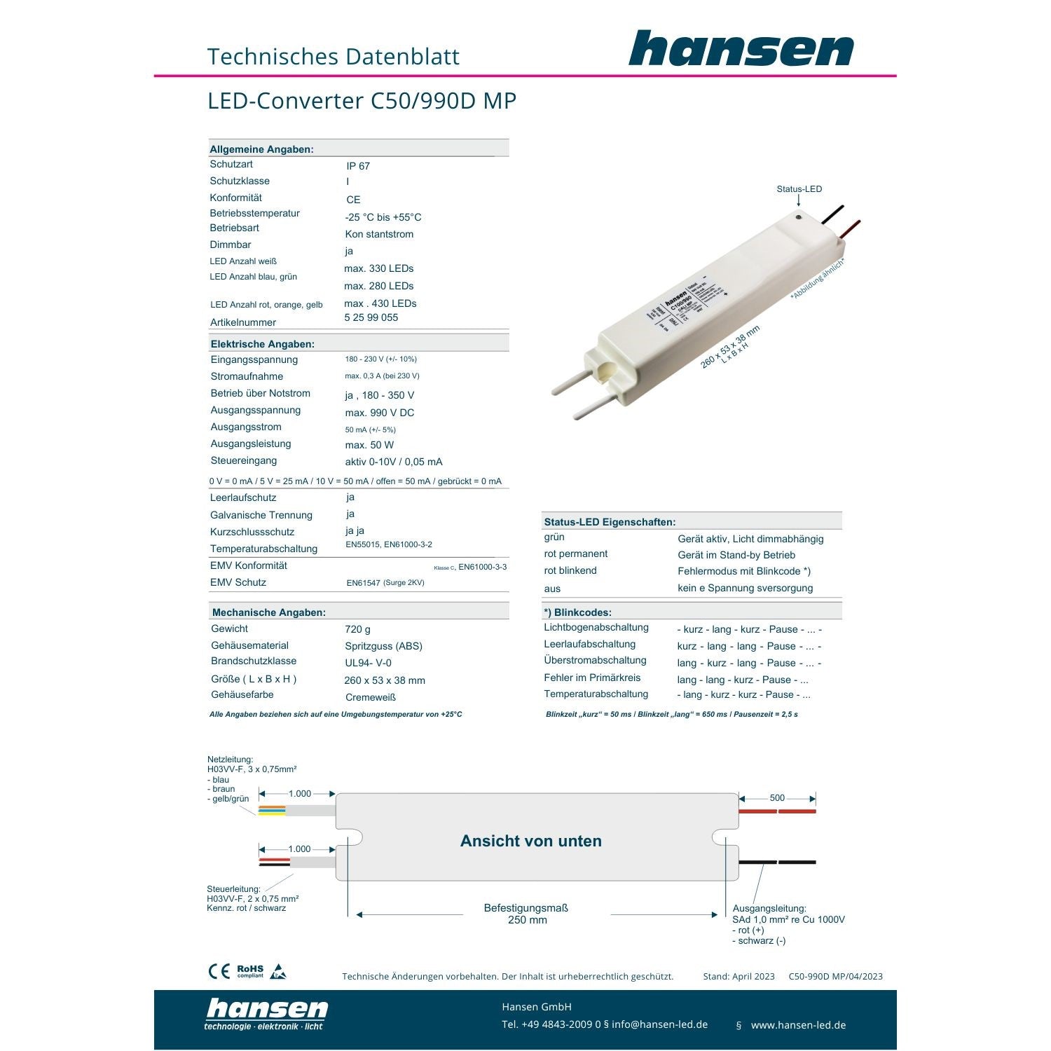 Schutzart: IP67 Brandschutzklasse B1 L=230,B=77H=36 Kurzschluss und leerlauffest https://www.hansen-led.de/produkte/details/led-converter