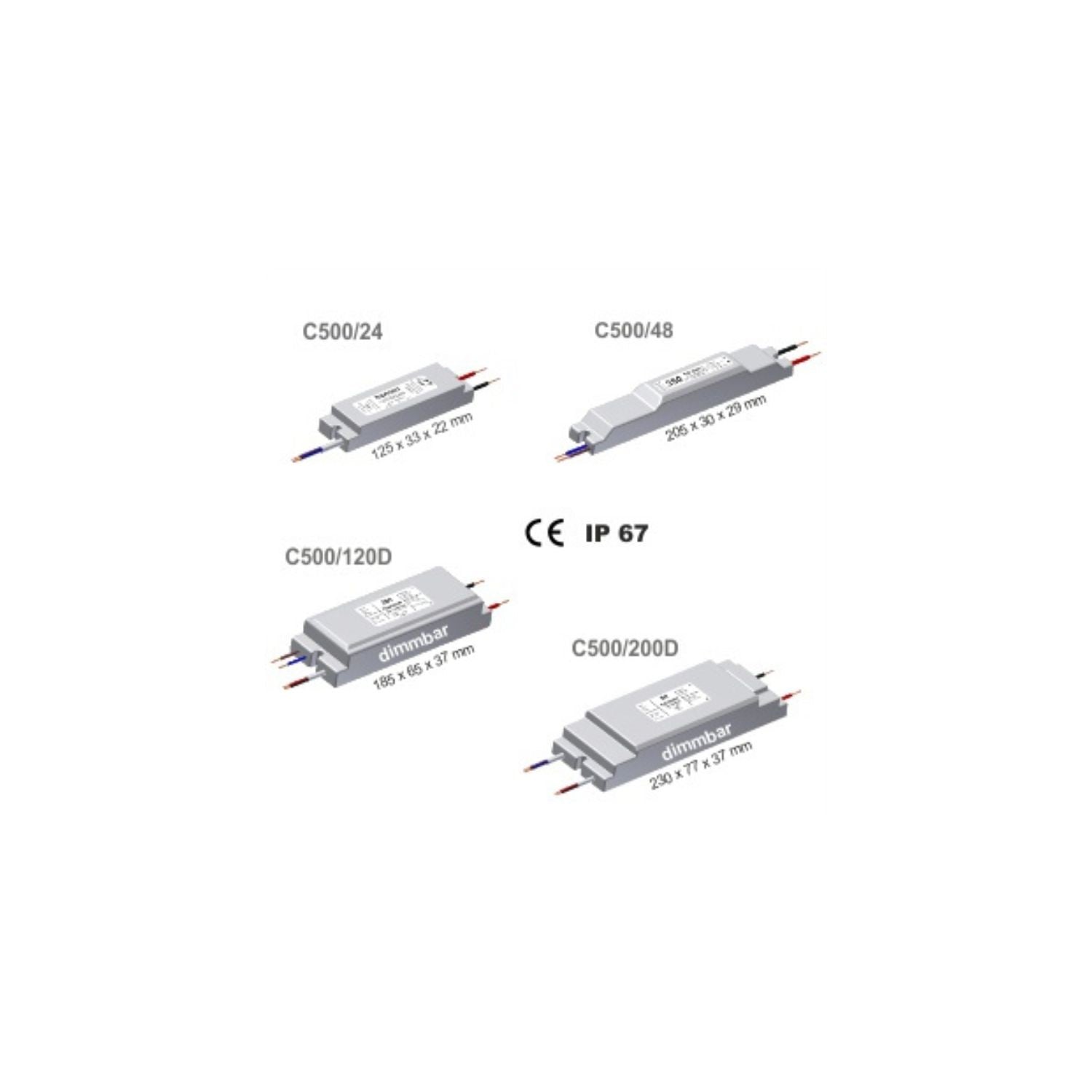 Primärdaten :230 Volt (+/-10 %), 50/60 Hz, max. 0,1 A Sekundärdaten: C500/200 : 185 Volt (DC, max.), 500 mA (+10 % / - 5 %) Funktionsbeschreibung :ŸDie Eingangsspannung (z.B. 230 V, 50 Hz) wird gleich gerichtet und mit einem Kondensator geglättet .Ÿ Eine zusätzliche Elektronik erzeugt einen konstanten Ausgangsstrom für die LEDs.Ÿ Der Ausgangsstrom ist voreingestellt (500 mA DC).Ÿ Die Ausgangsspannung stellt sich automatisch auf die jeweilige Last ein.