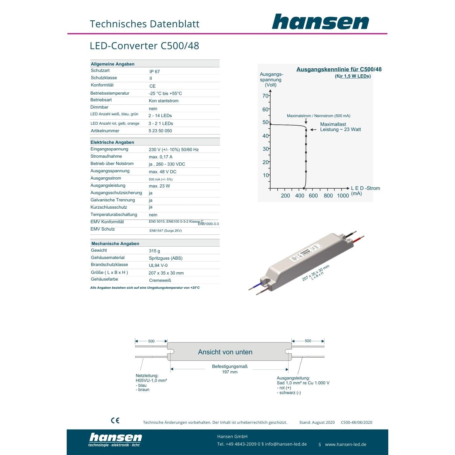 Primärdaten :230 Volt (+/-10 %), 50/60 Hz, max. 0,1 A Sekundärdaten: C500/48 : 48 Volt (DC, max.), 500 mA (+10 % / - 5 %) Funktionsbeschreibung :ŸDie Eingangsspannung (z.B. 230 V, 50 Hz) wird gleich gerichtet und mit einem Kondensator geglättet .Ÿ Eine zusätzliche Elektronik erzeugt einen konstanten Ausgangsstrom für die LEDs.Ÿ Der Ausgangsstrom ist voreingestellt (500 mA DC).Ÿ Die Ausgangsspannung stellt sich automatisch auf die jeweilige Last ein.